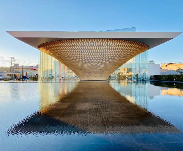 水面に映った富士山を指す「逆さ富士」をコンセプトとした、木造の展示棟が目を惹きます。