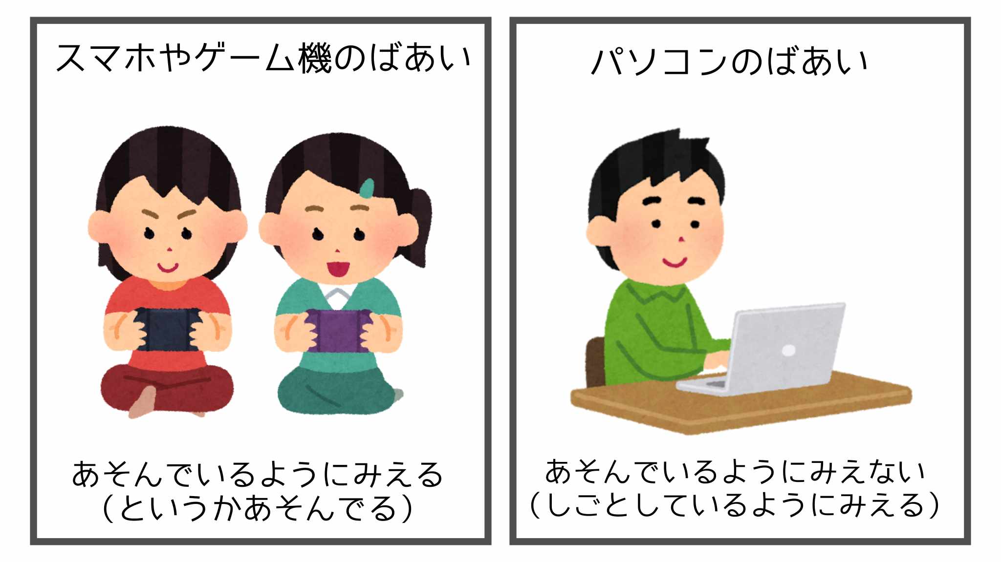 このほかにも、パソコンだと「あそんでいるようにみえない」というかくれたメリットもあります。